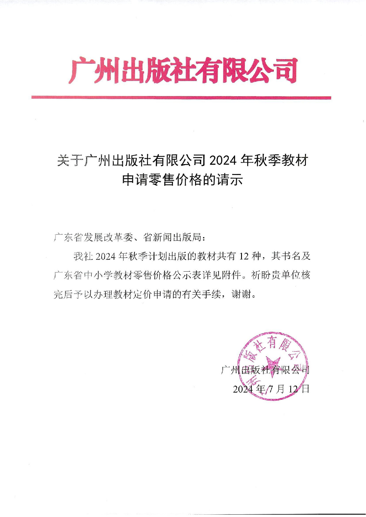 关于kaiyun开云官方网页版有限公司2024年秋季教材申请零售价格的请示
